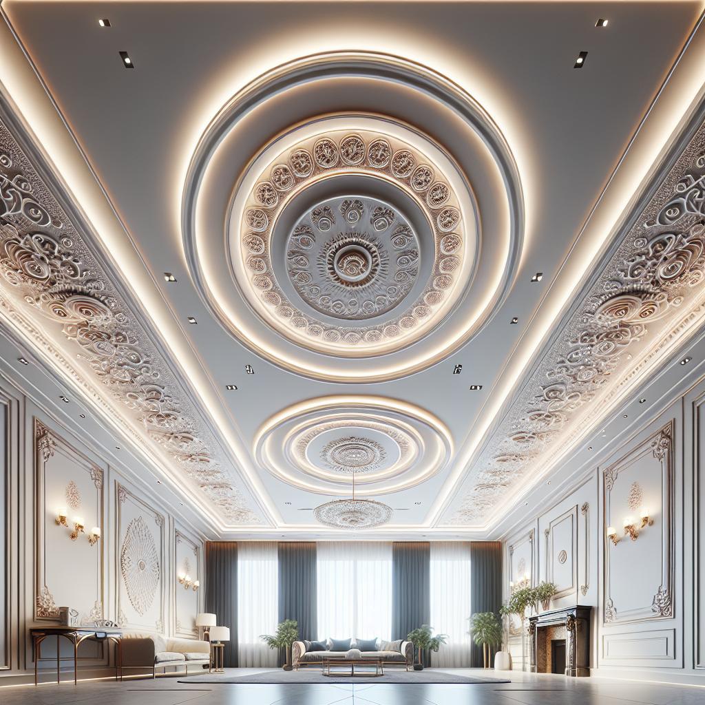 Освещение решает почти все. Потолок сам по себе декоративен, но без правильного света он теряет эффект. Варианты: встроенные точечные светильники, светодиодные ленты в нишах, центральные люстры, скрытая подсветка. Комбинируйте — именно сочетание дает объем и уют.